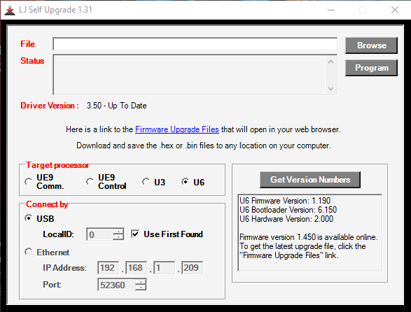 Click on “Get Version Numbers” to find out the current firmware versions on the device. Then use the provided Firmware Upgrade File internet link to go to labjack.com, go to the U6 Firmware subsection, and check for more recent firmware. Download firmware files to the any location on your computer.