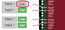 The Dashboard will read the current state of the digital input. Digital inputs have an internal weak pull-up resistor that holds them high when nothing is connected. When the GND wire is connected to FIO, the digital input will change from logic level High to logic level Low.