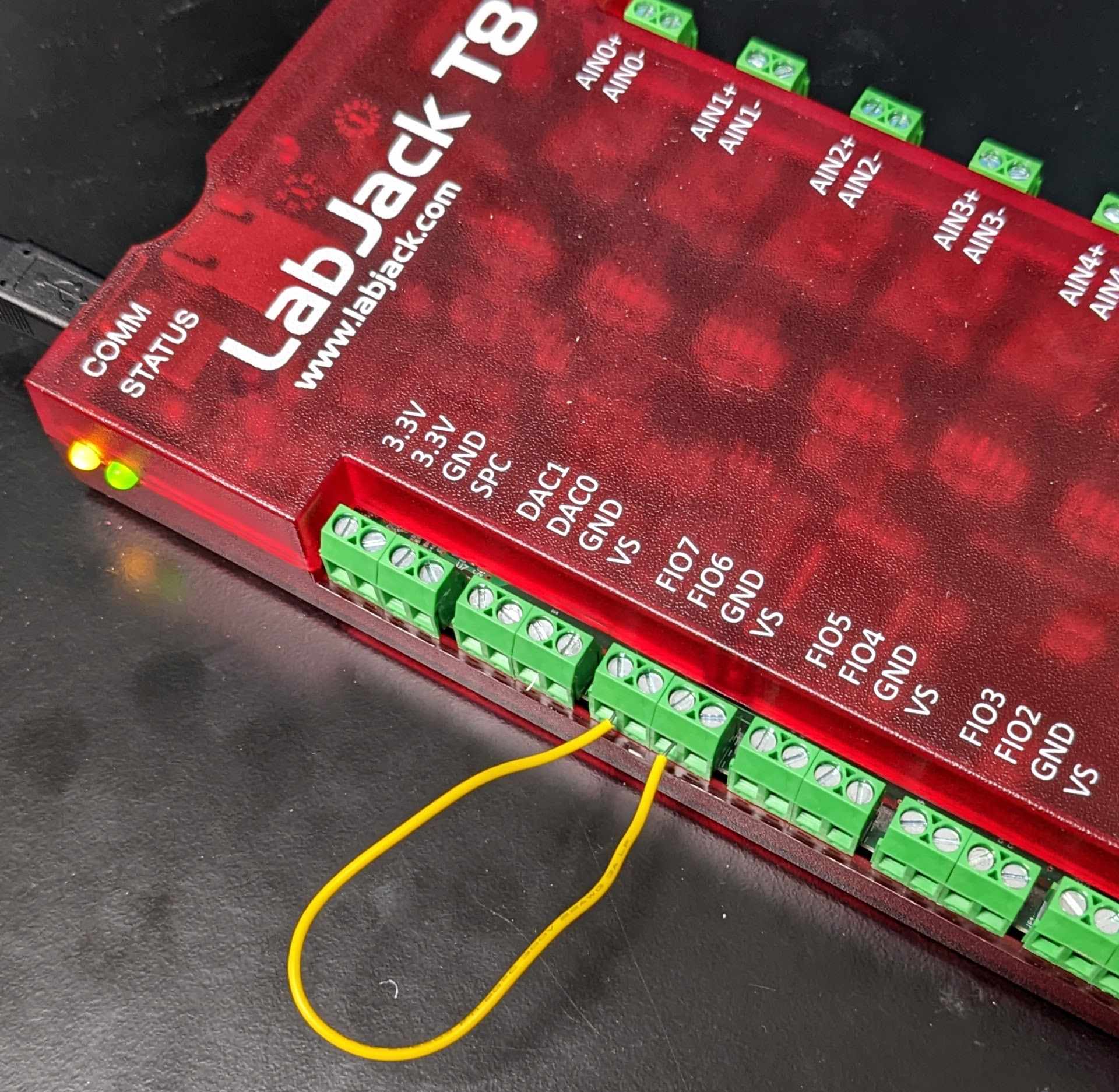 7. Connect a jumper wire securely from DAC0 to AIN0+ and GND to AIN0-.