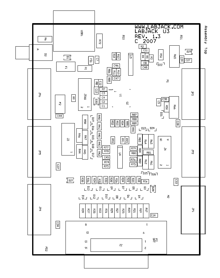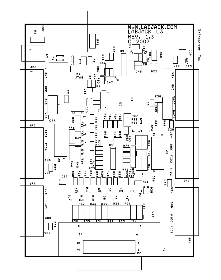 There is an OEM version of the U3 available. It is a board only (no enclosure, no screwdriver, no cable), and does not have most of the through-hole components installed. The picture below shows how the U3-OEM ships by default. Leaving the through-hole parts off makes the OEM board very flexible. Many applications do not need the through-hole parts, but if needed they are much easier to install than uninstall. See Appendix B for PCB dimensions.