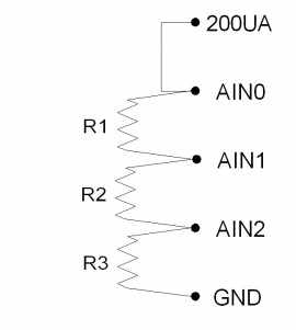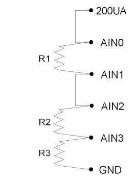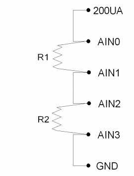 Figure 2.5-1 shows a simple setup measuring 1 resistor. If R1=3k, the voltage at AIN0 will be 0.6 volts.