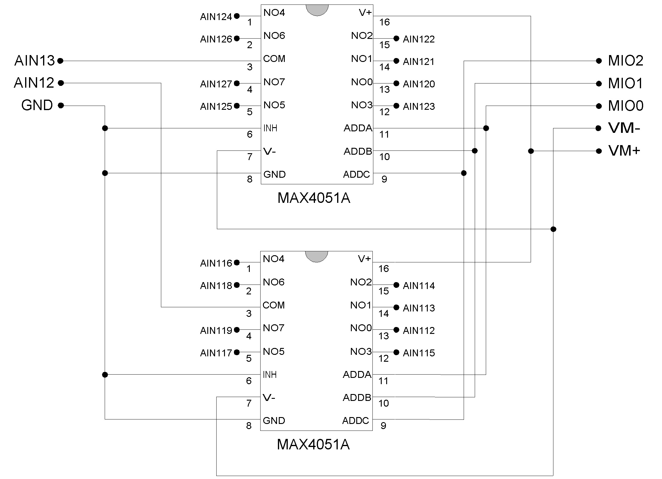 GND and Vref connect 0.0 volts and about 2.43 volts to the internal channels. These signals come through the same input path as channels 0-13, and thus can be used to test various things. Vsupply connects the 5 volt supply voltage (Vs) directly to the analog to digital converter through a voltage divider that attenuates it by 40%. The attenuation of this voltage divider is not measured during the UE9 factory calibration, but the accuracy should typically be within 0.2%. Note that a reading from this channel returns Vs during the execution of the command, and Vs might dip slightly while increasing a command due to the increased current draw of the UE9, thus this reading might be slightly lower than a comparative reading from an external DMM which averages over a longer time. The channels with the same names are identical. For instance, channel 133 or 141 both read the same internal temperature sensor. See "Section 2.7.4":/support/ue9/users-guide/2.7.4 for information about the internal temperature sensor. The "Mux80":/catalog/mux80 accessory uses multiplexer ICs to easily expand the total number of analog inputs available from 14 to 84, or you can connect multiplexer chips yourself. The DB37 connector has 3 MIO lines designed to address expansion multiplexer ICs (integrated circuits), allowing for up to 112 total external analog inputs. The MAX4051A (maxim-ic.com) is a recommended multiplexer, and a convenient ±5.8 volt power supply is available so the multiplexers can pass bipolar signals (see Vm+/Vm- discussion in "Section 2.12":/support/ue9/users-guide/2.7.4). Note that the EB37 experiment board accessory is a convenient way to connect up to 7 MAX4051A multiplexer chips, but the UE9s ±5.8 volt supply should still be used to power the chips as the ±10 volt supply on the EB37 is beyond the rating of the MAX4051A. Figure 2-2 shows the typical connections for a pair of multiplexers.