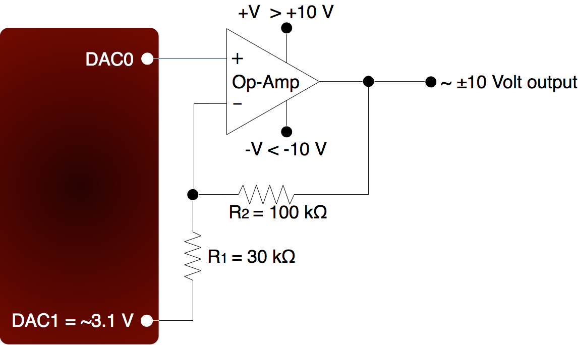 For bipolar output ranges, such as ±10 volts, a similar op-amp circuit can be used to provide gain and offset, and of course the op-amp must be powered with supplies greater than the desired output range (depending on the ability of the op-amp to drive it’s outputs close to the power rails). For example, the Vm+/Vm- supplies available from the U6 are typically ±13 volts. If these supplies are used to power the LT1490A op-amp (linear.com), which has rail-to-rail capabilities, the outputs could be driven very close to ±13 volts.