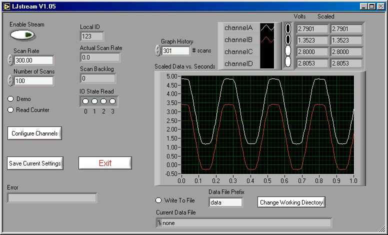 Uses stream mode to read, graph, and write to file, 4 AI channels. For more information, read about the stream functions (AIStreamStart, AIStreamRead, and AIStreamClear).