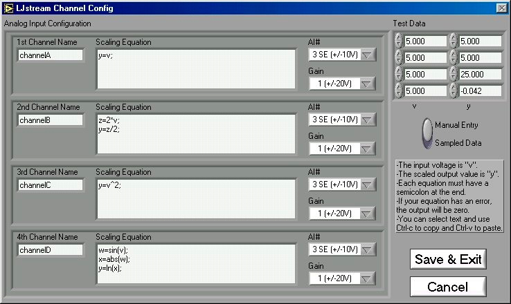 Figure 3.6-2 shows the LJstream channel configuration window. Here you can select analog inputs and gains and enter scaling equations. Use “Test Data” to see the effect of the scaling equations (“v” column is the measured voltage and the “y” column is the output of the scaling equations). “Manual/Sampled” determines where the “Test Data” in the “v” column originates.