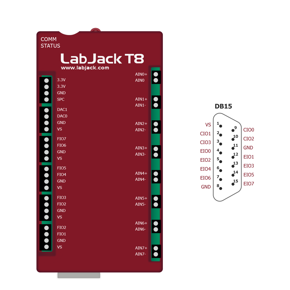 Screw Terminal Edges: The screw terminal edges have convenient connections for the 2 analog outputs, 4 high-voltage analog inputs, and 4 flexible I/O (digital I/O, low-voltage analog inputs, or DIO-EF. The screw terminals are arranged in blocks of 4, with each block consisting of VS, GND, and two I/O. Also on the left screw-terminal edge are two LEDs. The Comm LED generally blinks with communication traffic, while the Status LED is used for other indications.