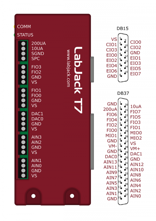 DB Edge: The DB Edge has a 15-pin female D-sub type connector (DB15) which has 12 digital I/O called EIO and CIO.