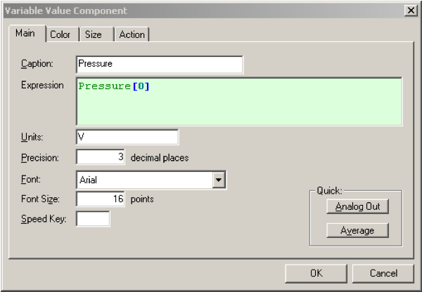 ThChannel View certainly provides a quick look at your data, but is not the most convenient or flexible way to display your data, especially once you have more than one channel. In this section we'll add a component to a page that will display data from the Pressure channel. This assumes, of course, that you created an analog Pressure channel in the basic I/O chapter. If you didn't, load the document LJGuideSamples\InputsSimpleWithDA.ctl and start from there.
