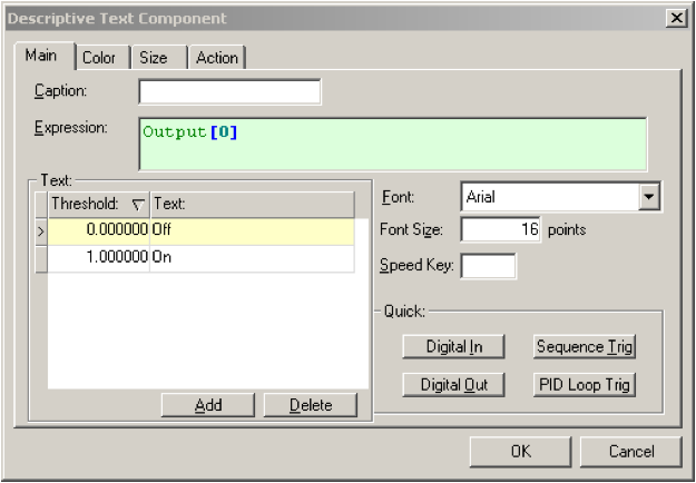 As you may have noticed, there is also a button labeled Digital Out, which does almost the exact same thing as the Digital In button, except that it makes the descriptive text component into a clickable component that will toggle the output between 0 and 1. It does this by changing the component's Action. You can see this by clicking on the Action tab of the components properties. Feel free to create a new Descriptive Text component then go into the component's properties, click Digital Out, enter Output, then on closing simply click on the component to toggle Output instead of going to the command alert window.