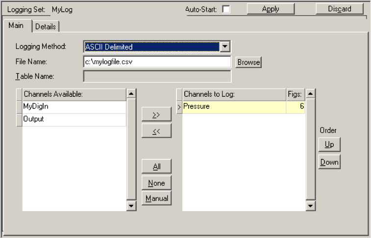 Each logging set can log any combination of channels. In this case, we will just log the input channel.