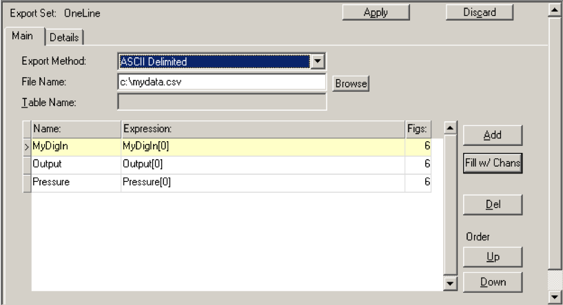 This button automatically fills the export set columns with each of your channels, setup to log the most recent reading only (notice the [0] after each expression in the table). This is the typical setup for conditional logging. Unlike logging sets, export sets can also log calculations and anything else you can describe in a DAQFactory Expression.