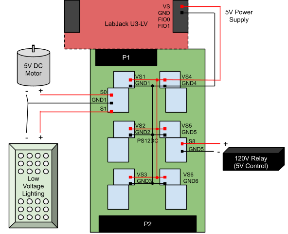 5V is distributed to all 6 power supply blocks. All 12 switches are fed 5V from the LabJack. This is a common configuration for simple testing, since the LEDs will illuminate when the LabJack is powered on, and it does not require an external power supply.