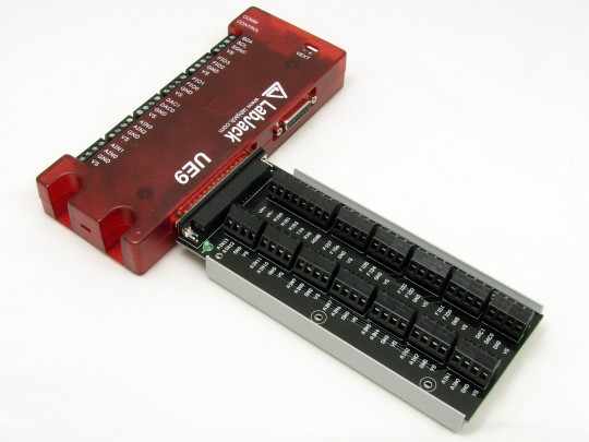The CB37 terminal board connects to the DB37 connector on the LabJack U6, UE9, or T7, and provides convenient screw terminal access. The CB37 is designed to connect directly to the LabJack (see image below), but can also connect via a 37-line 1:1 male-female cable (not included). Since the CB37 V2.1 has screw-terminals with the same IO/IO/GND/VS arrangement as the U6/UE9/T7 itself, it is compatible with LJTick signal conditioning modules.