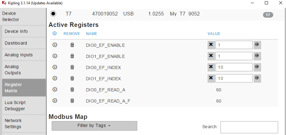 T-series devices have the capability to read and interpret a quadrature input signal as a part of the Digital I/O Extended Feature (DIO-EF) system. In this example we will use the Kipling Register Matrix to enable and read a quadrature encoder. The quadrature input mode will immediately begin storing the encoder count in a register once enabled and this register can be read or cleared at the user's convenience.