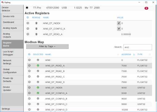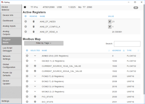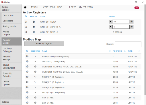 Kipling has special high-level support for AIN-EF configuration on the Analog Inputs tab for the T4, T7/T7-Pro, and T8, but for the purpose of this tutorial we are using the Register Matrix instead.