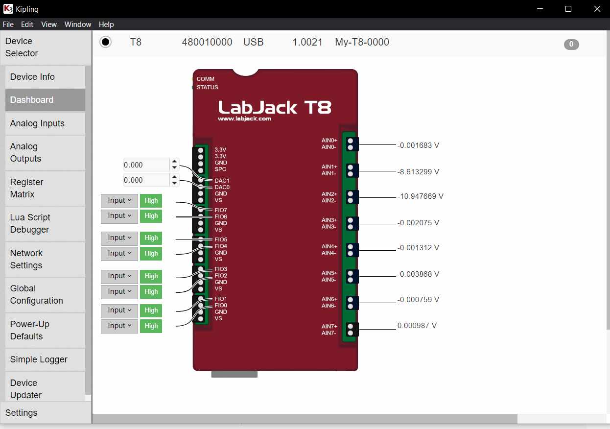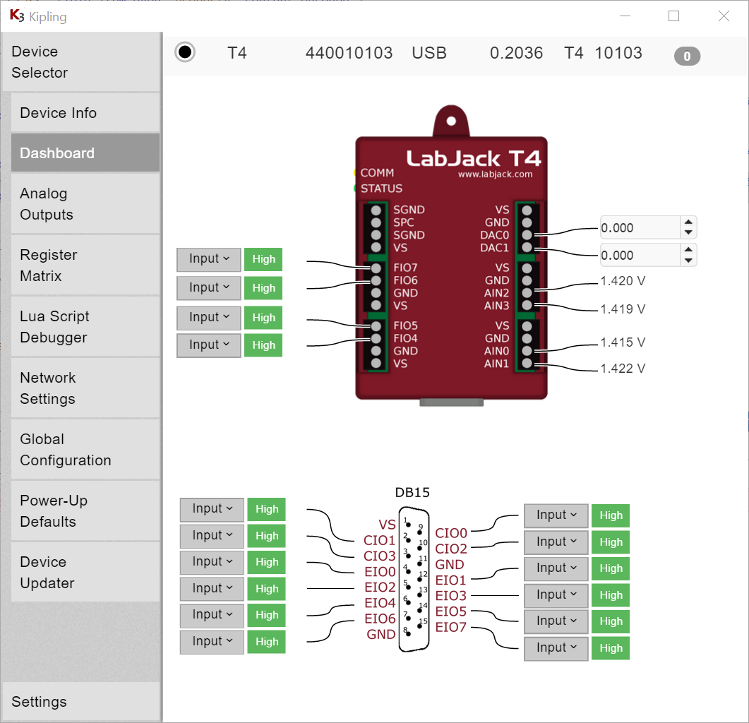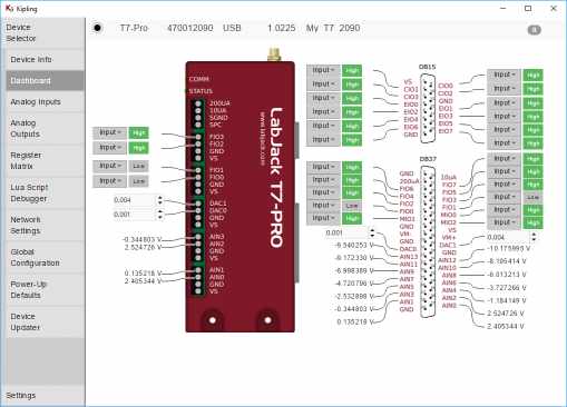 After selecting devices, a tab named "Dashboard" is available that displays and controls the basic functionality of a device. This tab shows the outputs of the DB37 and DB15 connectors.