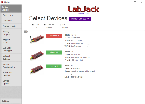 Use the Device Selector tab to find available devices and connect to them. Kipling can connect to and control multiple devices. The Refresh Devices button performs a search to find compatible LabJack devices.