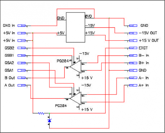 The EI-1040 requires +5 volts DC at a nominal 0.1 amp. An internal DC to DC converter supplies an output of +15 and –15 volts nominal. The EI-1040 consists of 2 Burr-Brown/TI PGA204 amplifiers and one DCP010515DPB DC to DC converter.