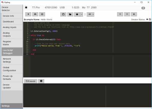 Write, run, and debug Lua scripts that execute on-board the device, independently from a computer. Lua script examples are built into the program—they provide a great place to start exploring functionality.