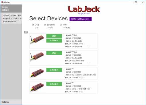 Kipling features a simple device selection process that makes it easy to see a device's connectivity options and provides immediate information about each found device.