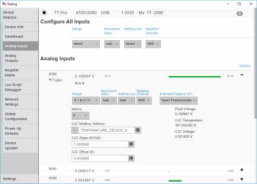 T-Series devices are highly capable devices with a multitude of analog features. Kipling makes them easy to learn about, configure, and use. Explore the device's extended features through a graphical interface. (Analog extended features simplify reading thermocouples/thermistors, RMS, and other readings.)