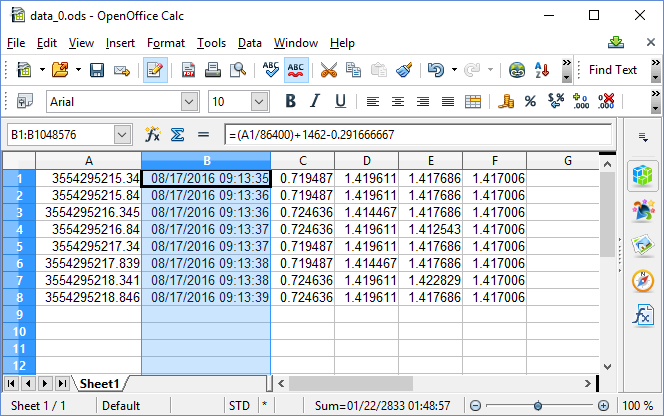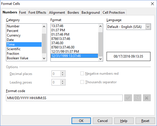 Column B now has days since 1900. That is the native time format of Calc so we can now tell Calc to format the cells as desired. With the entire column selected, click Format→Cells to get the window below. Set Category to Date or Time and select the desired Format. Click OK.