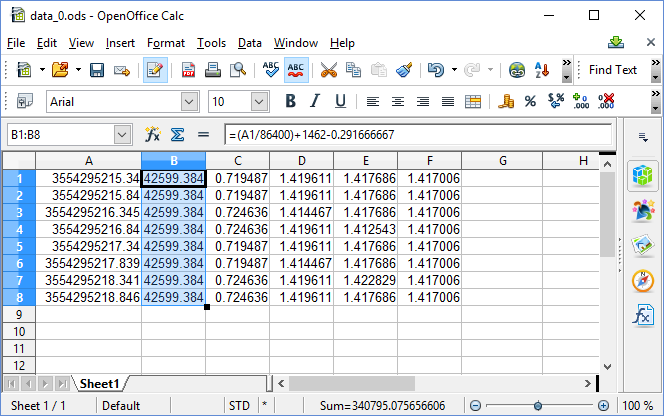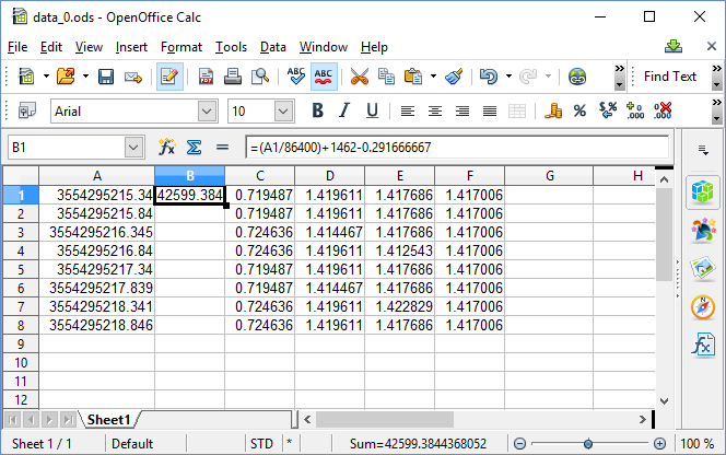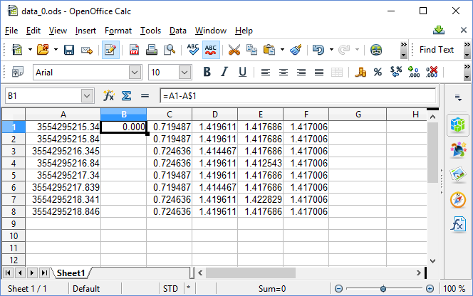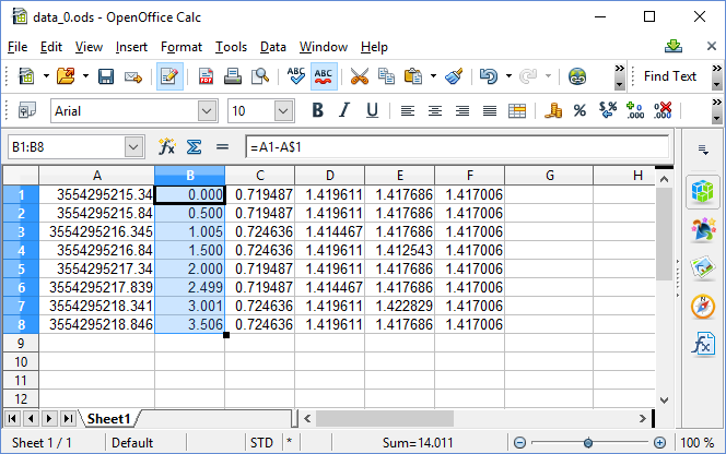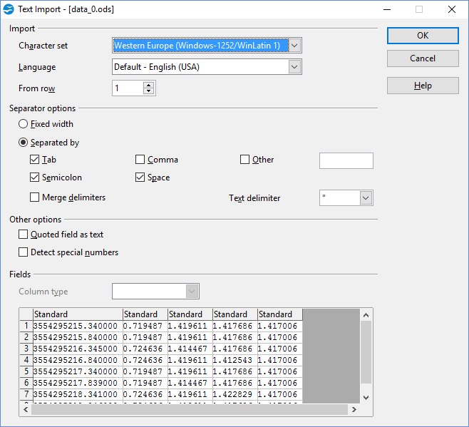 Double-click the .ods file to open it in Calc. In the text import window make sure Tab is selected since LJLog saves a tab delimited file. Click OK to proceed.