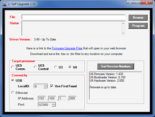 Click on Get Version Numbers to find out the current firmware versions on the device. Then use the provided Firmware Upgrade File internet link to go to labjack.com, go to your device's (U3, U6, or UE9) Firmware subsection, and check for more recent firmware. Download firmware files to any location on your computer.