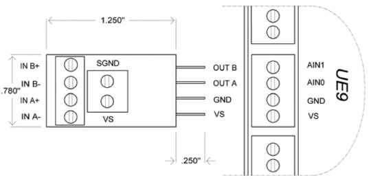 The pins shown on the right side of the LJTCS (Figure 1) connect to the LabJack. The VS/GND pins power the LJTCS, while the OUTA/OUTB pins send the output voltage signal to analog inputs on the LabJack.