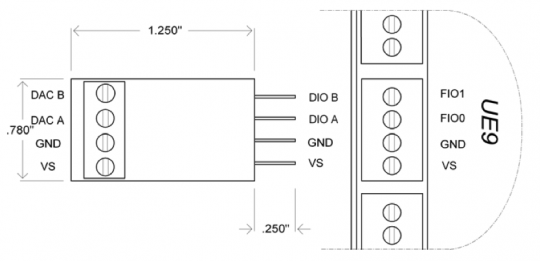 The pins shown on the right side of the LJTDAC (Figure 1) connect to the LabJack. The VS/GND pins power the LJTDAC, while the DIOA/DIOB pins are used for digital communication (I2C) between the LJTDAC and LabJack. DIOA is the serial clock (SCL) and DIOB is the serial data (SDA). Following are descriptions of the screw-terminal connections: