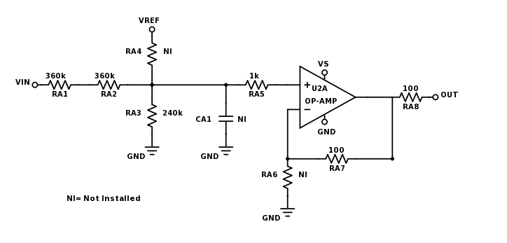The above figure is a schematic for one channel of the LJTD, showing the standard factory installed values for UNI10V. The input/output relationship is described by the below equations, assuming the op-amp is in the default unity gain configuration.