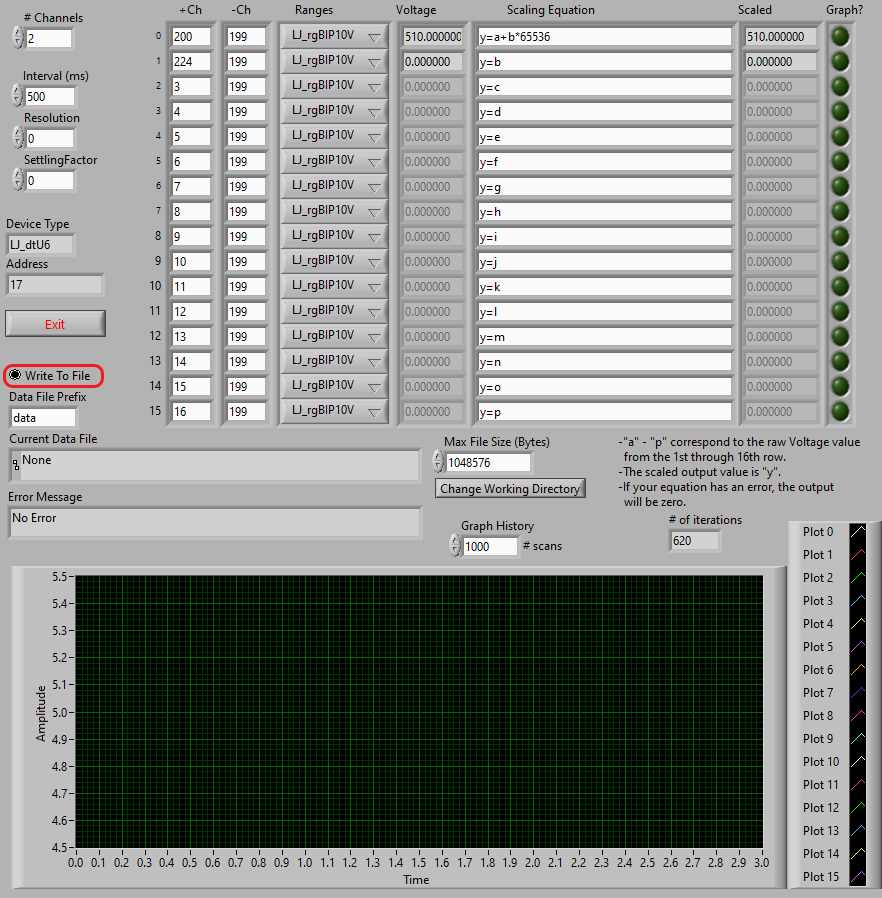 The following tutorial demonstrates how to configure timer/counter features in LJLogUD. The tutorial can also apply to LJStreamUD with the exceptions that the Start Stream buttons must be pressed before data begins to be logged to file, and scaling equations must be enabled by de-selecting the Disable Scaling button. Also note that stream mode operation used in LJStreamUD has implications for timer performance.