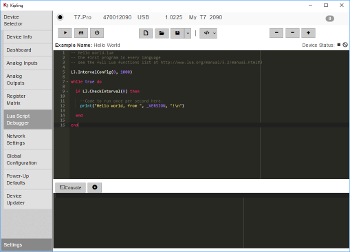 After selecting devices, a tab named "Lua Scripting" is available. It is used to write and debug scripts that execute on-board T-Series devices. Details about Lua scripting are in the device datasheet Lua Scripting section.