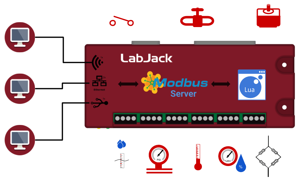 One common application of Lua Scripts is to execute tasks and export status variables to a logging program. These scripts can use USER_RAM registers to pass data from the Lua script to any other program accessing the T-Series device. LabVIEW, C#, Python, or any other supported languages can access the T-Series device and read from or write to these registers. LJLogM can be used for easy logging of data from the various sensors. Several example scripts like these can be found in the I2C Sensor Examples website section.