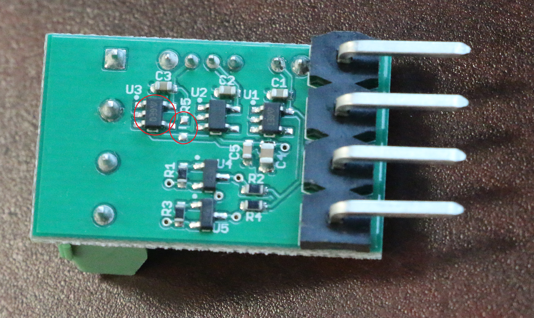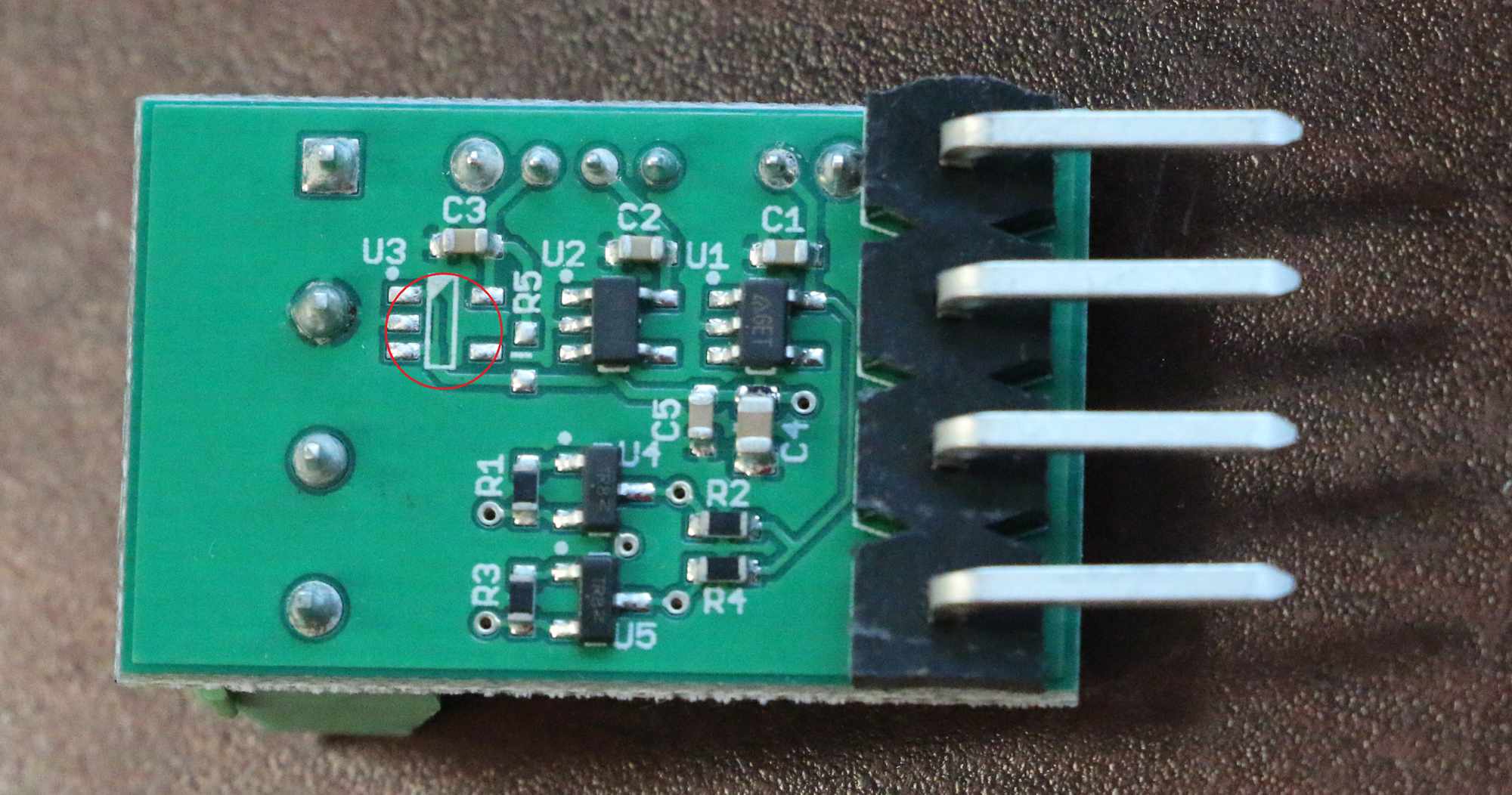 On the bottom side of the tick, locate the 1.8V regulator chip (U3) and the un-populated R5 resistor pad.