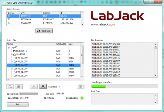 (v1.24)* Updated the download on 4/25/2016. Last tested with T7 FW v1.0199. Fixed a bug due to a new error code being added for listing the files in the current working directory.