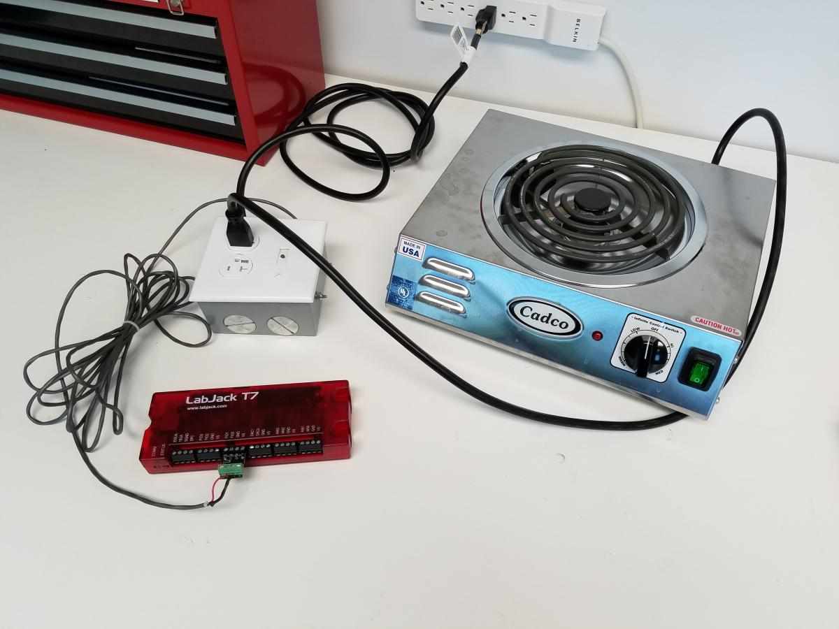 The receptacle shown here is rated for 20 A, but the cord that plugs into the wall is rated for 15 A, so 15 A is the maximum current that can be sourced by this device. For this project, it is recommended to use the Kyotto KD20C40AX 40 A, 280 VAC Solid-State Relay. This does not fully utilize the capabilities of the relay, but works for most applications, and minimizes cost. There are many options for solid state relays, the recommended relay should work for most applications. Because the recommended relay will be operating well below its maximum ratings, the heat output is manageable, and is easily dispersed into the surroundings. At 13 A load, the relay reached only 32°C (90°F), which is well within the operating range of the relay. Many solid-state relays, including the recommended relay, are optically isolated from the load side of the relay, which mitigates the possibility of damage to the LabJack.
