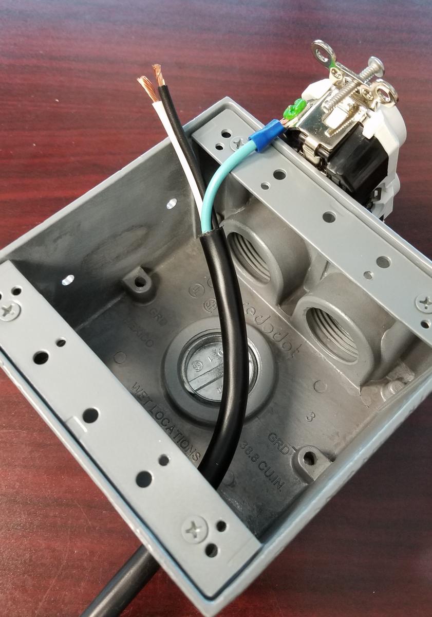 Install the wire clamps into the enclosure. Thread the cord into the box through a hole on the opposite side from the holes that were just drilled. You may need to bring the insulation back further to allow for the 3 conductors to reach the outlet and relay. A knot can be tied in the cable to prevent wire strain, but this step is optional. Connect the black wire to the black side of the outlet, the green to the green screw, and the white to a terminal on the relay (Terminal 2 on the recommended SSR) The output side of the SSR (1 on the recommended SSR) must be connected to the white side of the outlet. Spade-type crimp connectors may be needed for connections to the relay and/or outlet.