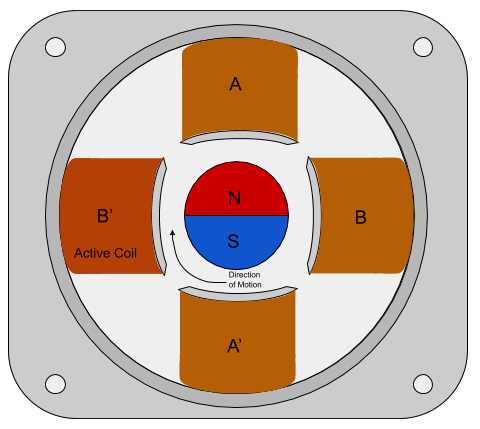 Basic Diagram of Stepper Motor rotating due to a single coil being activated.