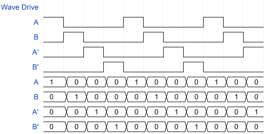 One Phase On - Full Step Drive: Also called Wave Drive mode, in this mode only one phase is energized at a time. This is the most simple mode of stepper control and it also requires the least amount of power.