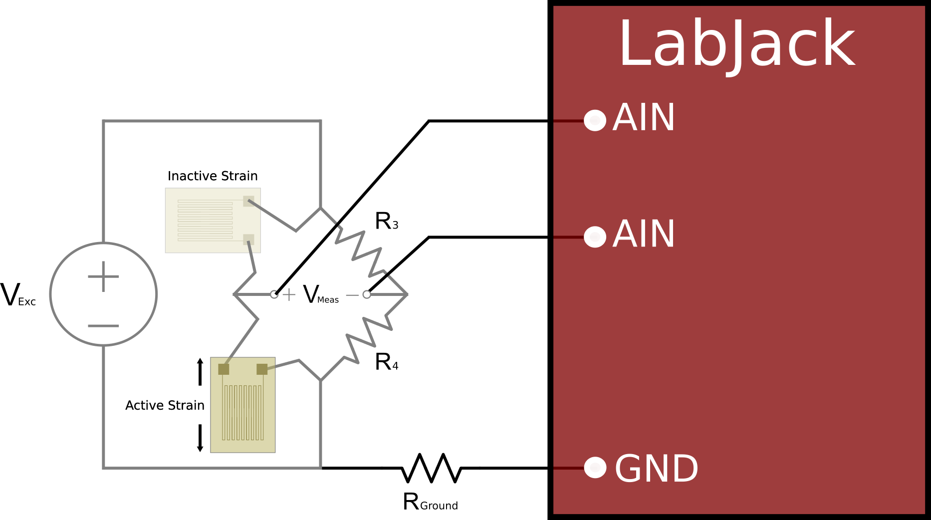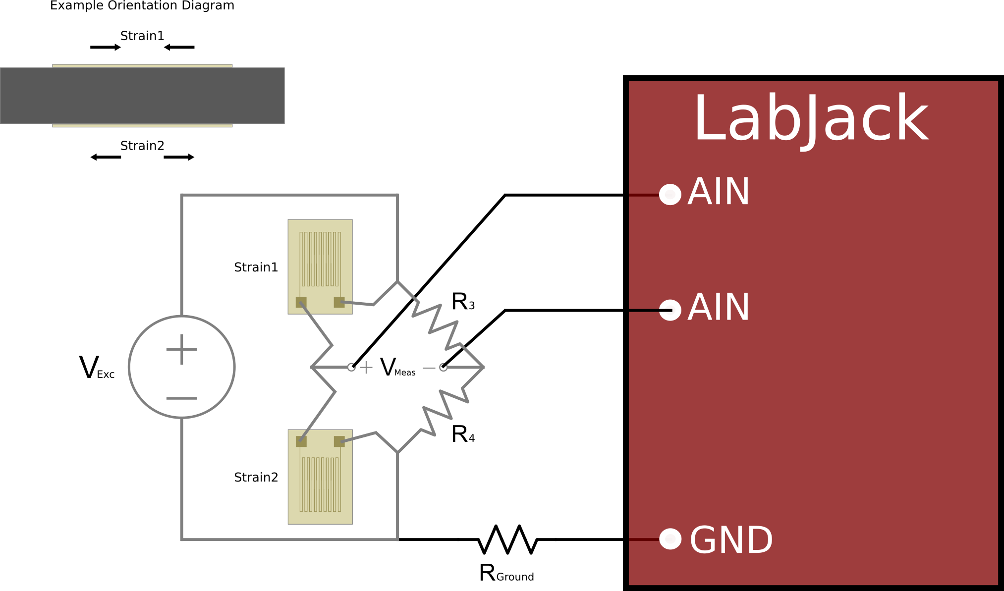 Strain measurements should typically be configured in a bridge circuit to aid in measuring the small resistance changes. A typical bridge circuit diagram is provided below.