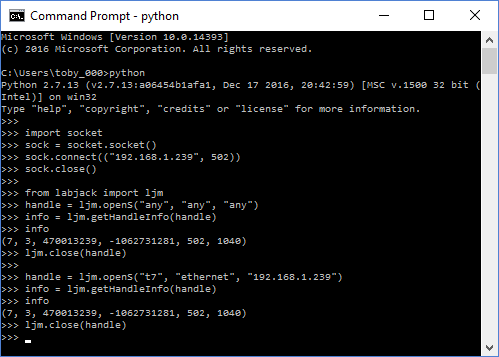>>> handle = ljm.openS("t7", "ethernet", "192.168.1.239")>>> info = ljm.getHandleInfo(handle)>>> info(7, 3, 470013239, -1062731281, 502, 1040)>>> ljm.close(handle)